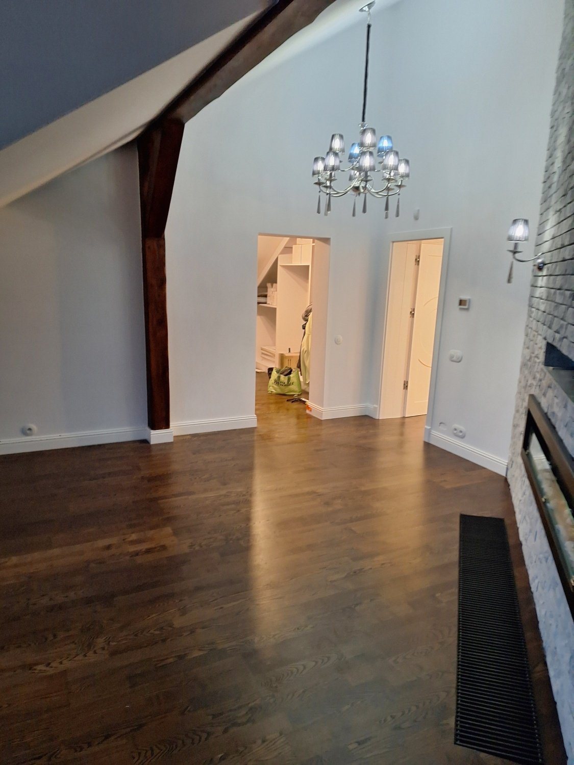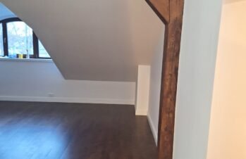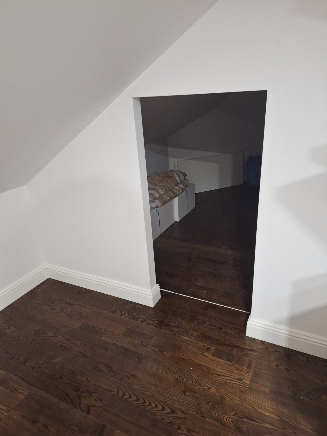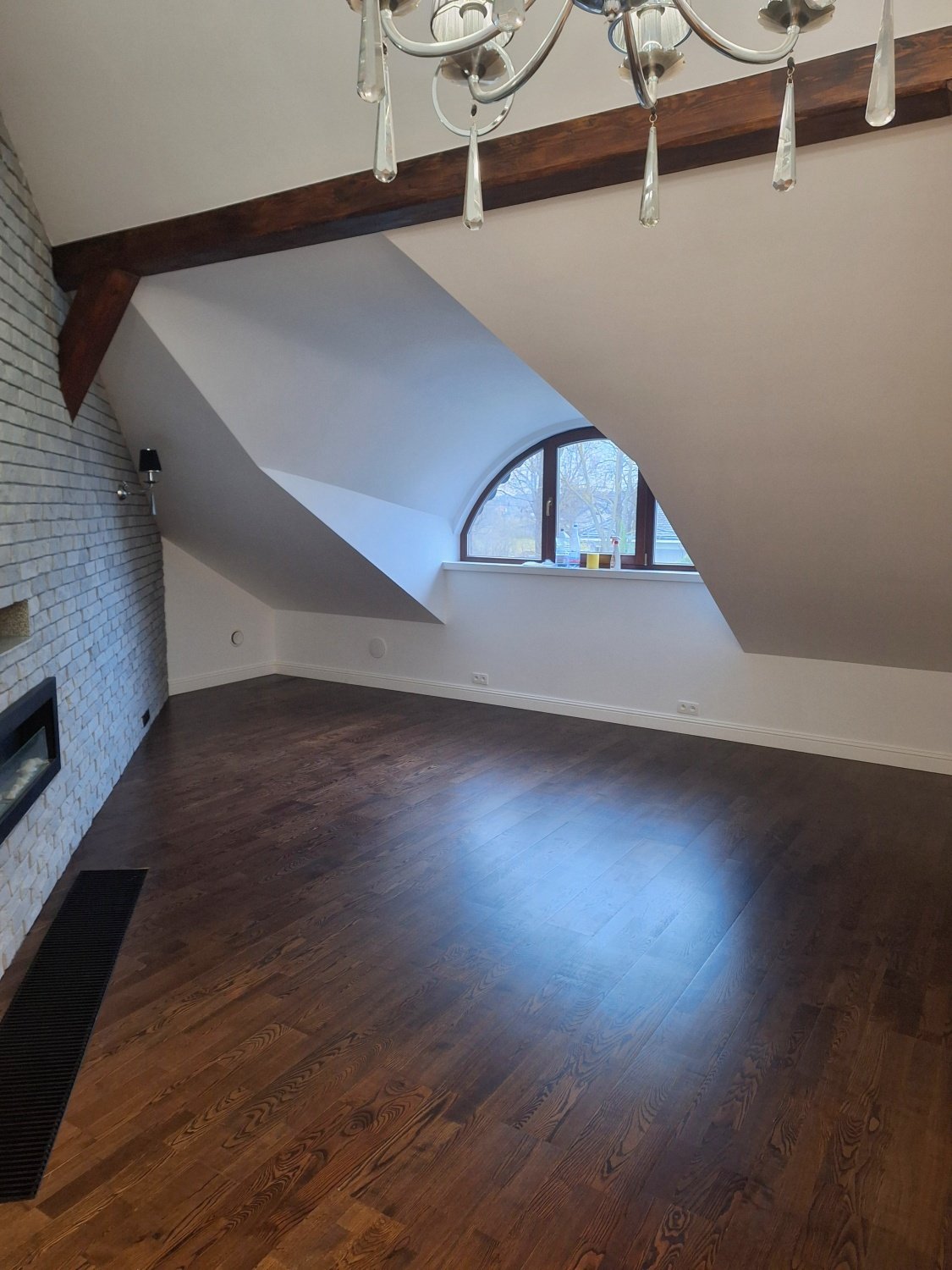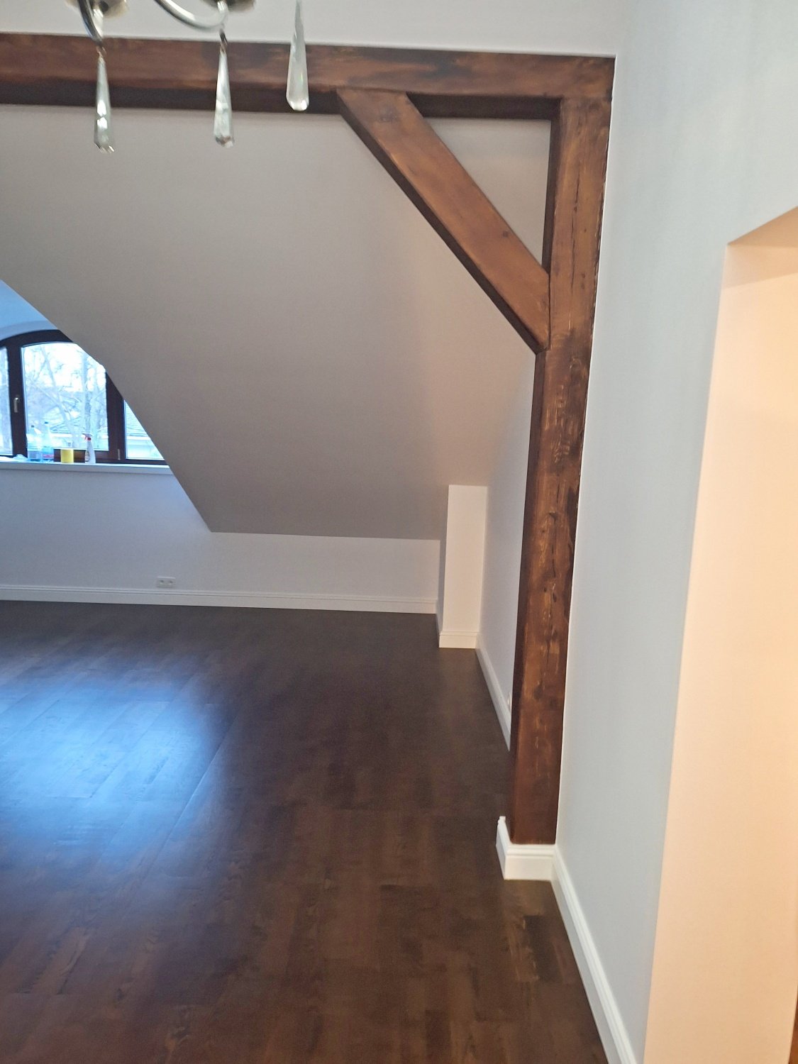 Pierwsze piętro i poddasze zostały w pełni wykończone i doprowadzone do wysokiego standardu. Drewniane belki, odpowiednio zabezpieczone i wybarwione, stały się wyrazistym elementem dekoracyjnym wnętrza. Nowe oświetlenie podkreśliło architekturę skosów, a dopracowane detale – takie jak szczeliny przy schodach czy uzupełnione listwy – nadały całości estetyczny i spójny charakter.