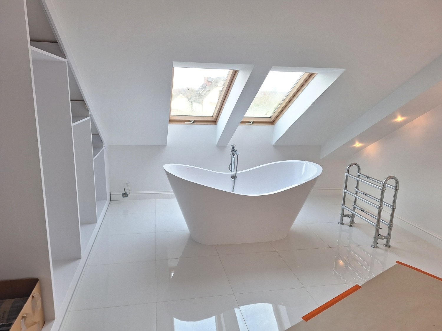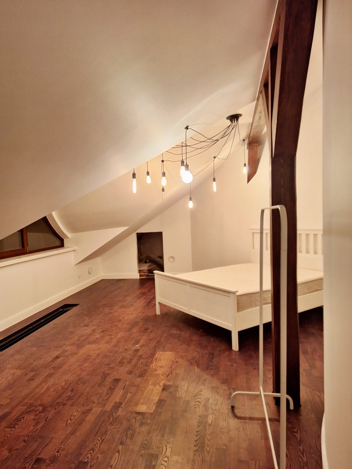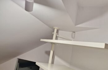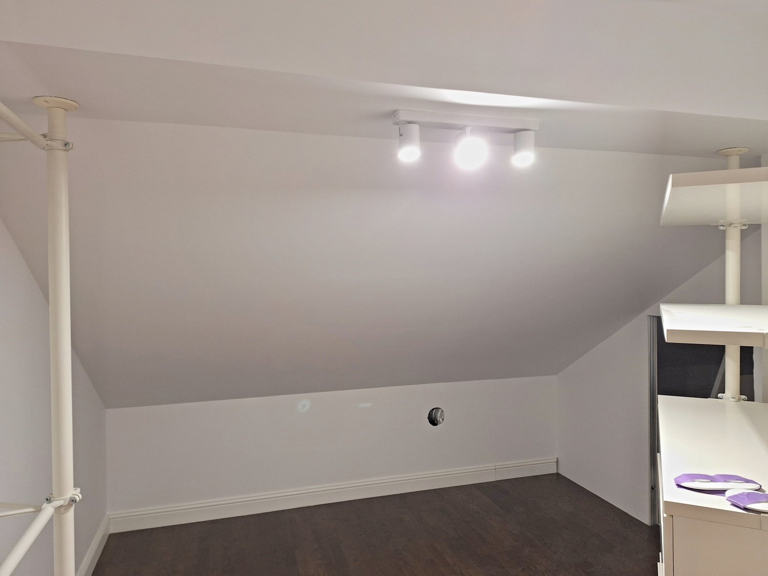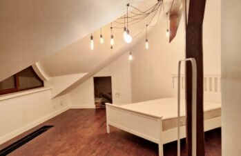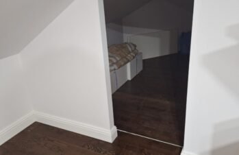 Pierwsze piętro i poddasze zostały w pełni wykończone i doprowadzone do wysokiego standardu. Drewniane belki, odpowiednio zabezpieczone i wybarwione, stały się wyrazistym elementem dekoracyjnym wnętrza. Nowe oświetlenie podkreśliło architekturę skosów, a dopracowane detale – takie jak szczeliny przy schodach czy uzupełnione listwy – nadały całości estetyczny i spójny charakter.