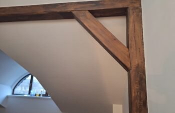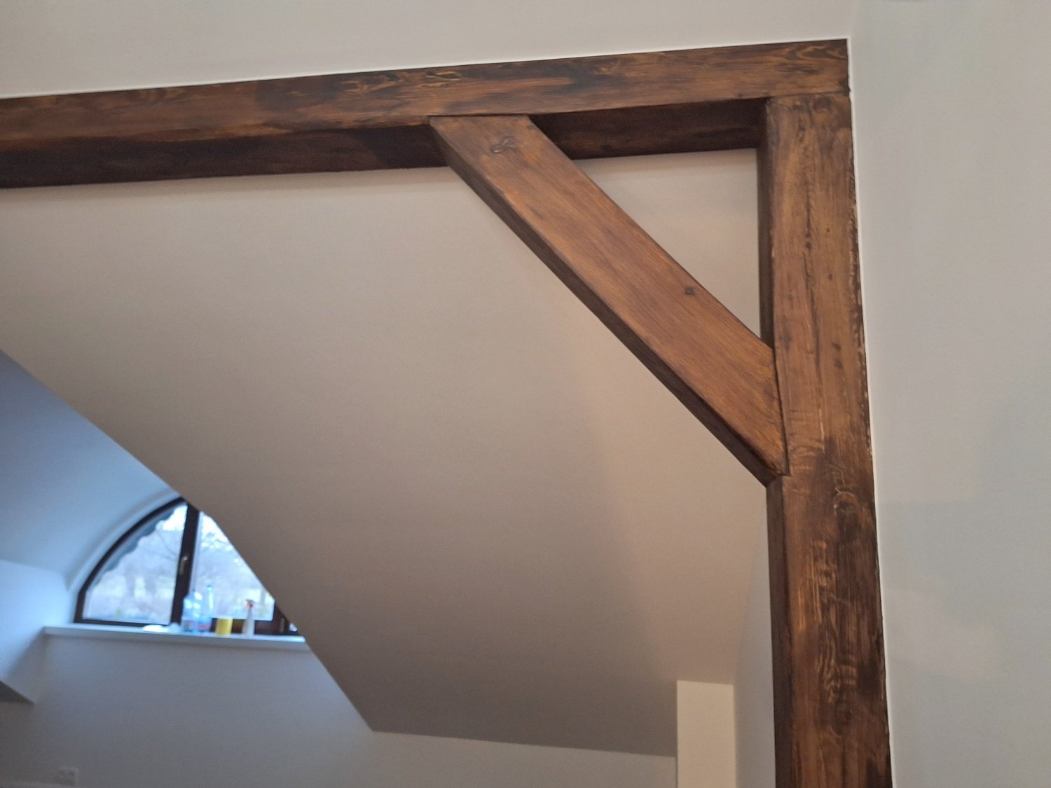 - renowacja i bejcowanie drewnianych belek konstrukcyjnych (ciemny, wiśniowy odcień)