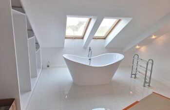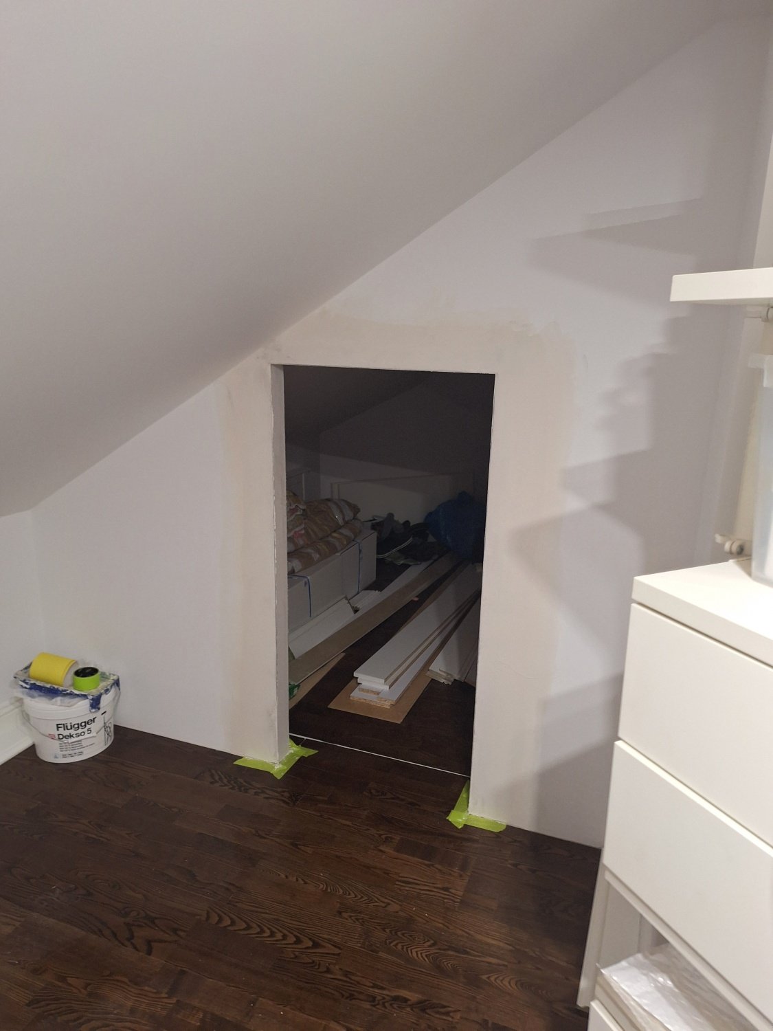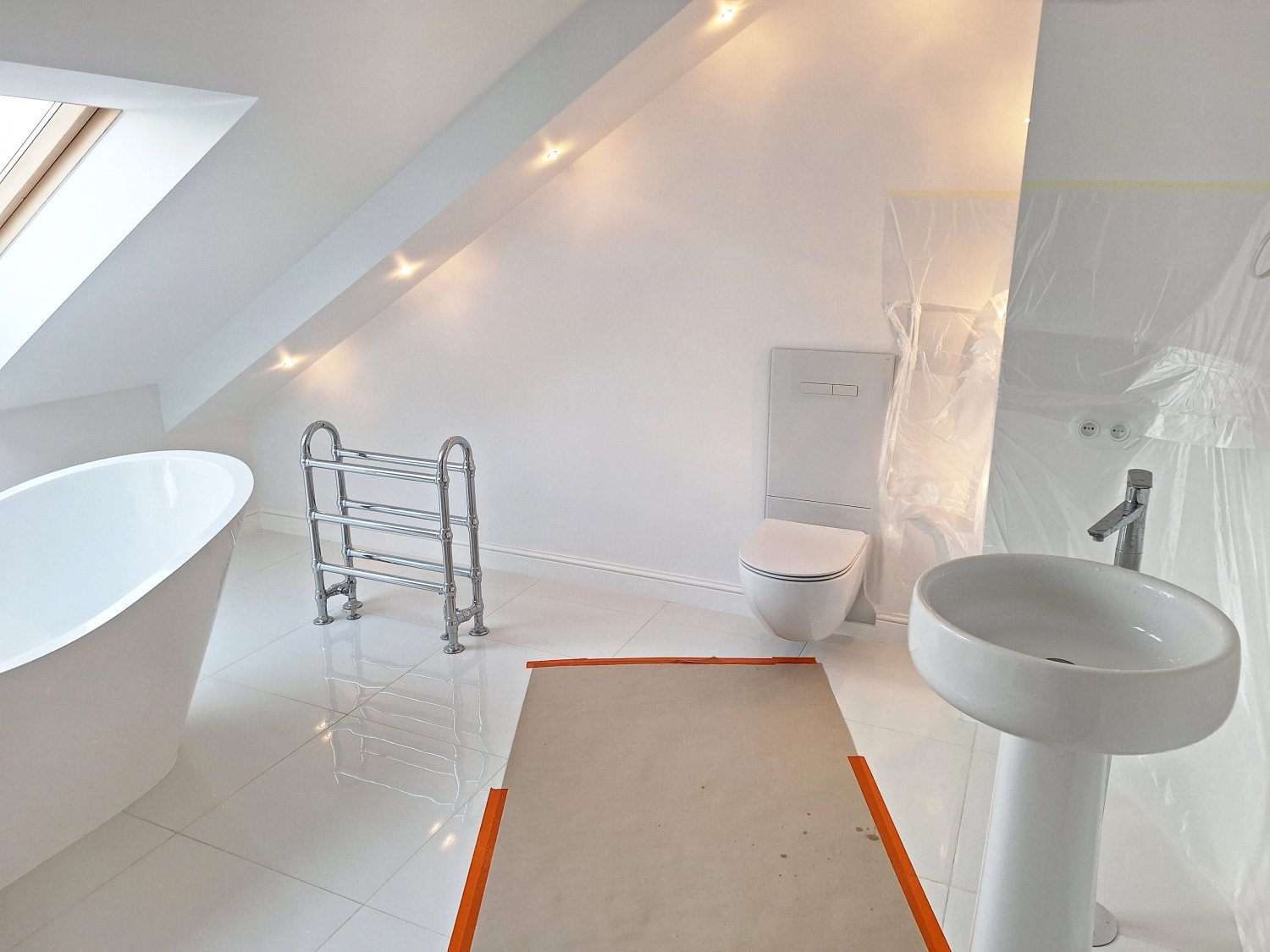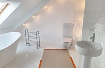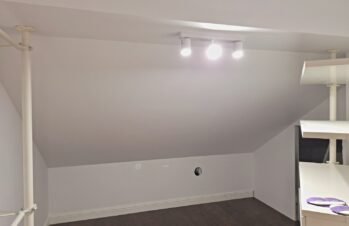 W październiku–listopadzie 2025 roku zrealizowaliśmy kompleksowe wykończenie pierwszego piętra oraz poddasza w domu jednorodzinnym w Nieporęcie.