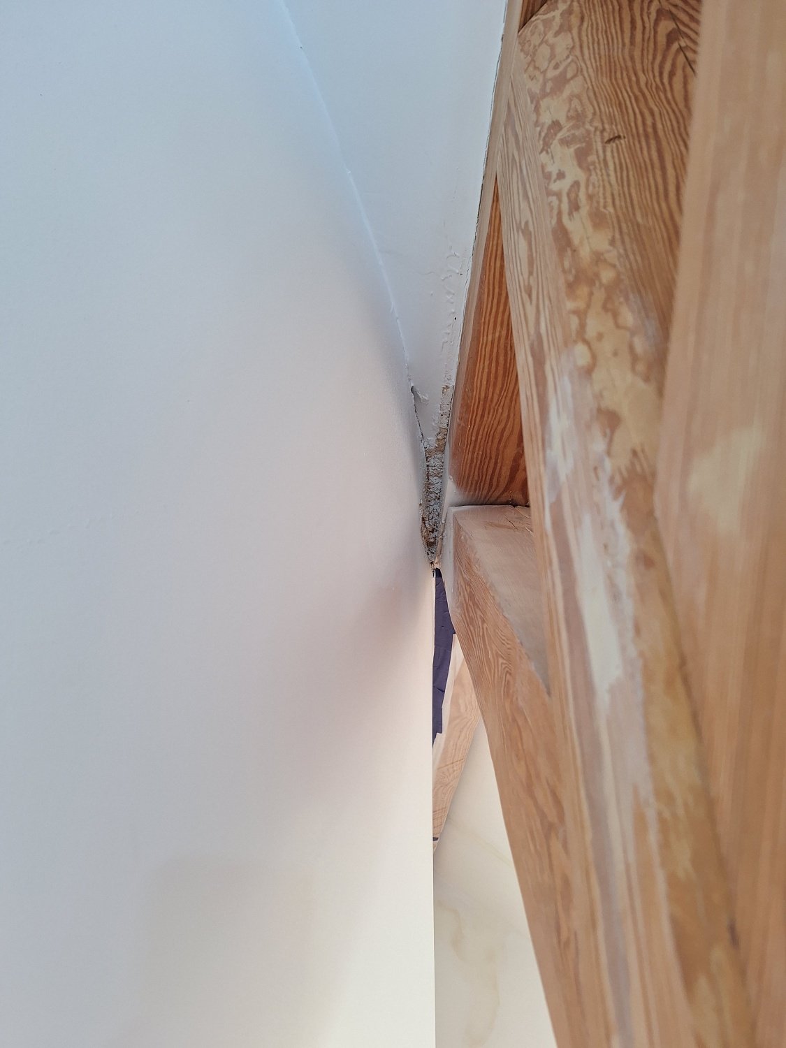 Na poddaszu brakowało listew przypodłogowych, a ramy okienne miały wieloletnie zabrudzenia farbą po pracach deweloperskich. Przy schodach widoczne były szczeliny i brak fragmentu ściany.