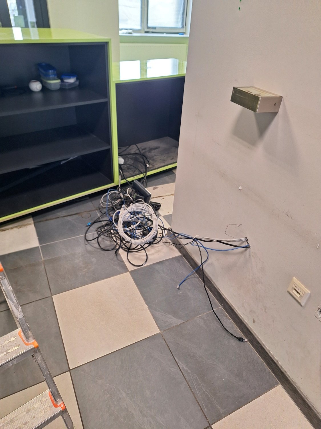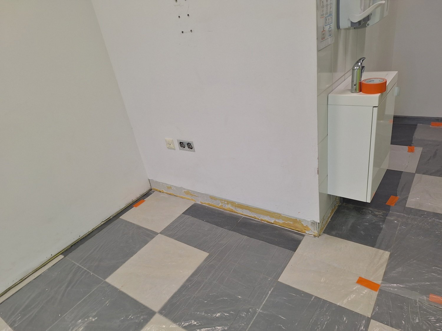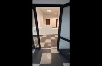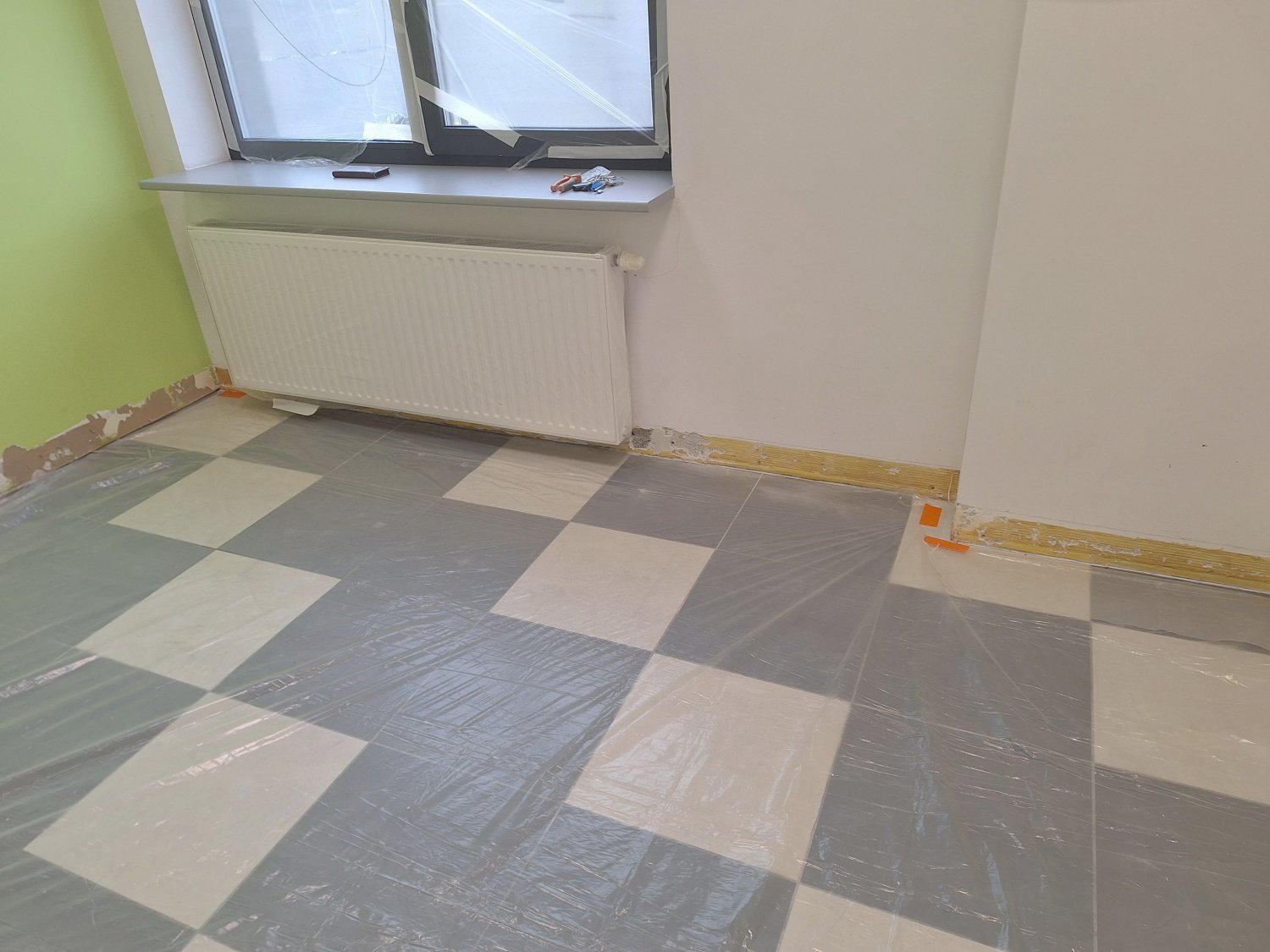 Lokal był w słabym stanie po poprzednich użytkownikach. Na podłodze, bezpośrednio na płytkach, znajdowała się zużyta wykładzina typu linoleum, która była mocno zniszczona i nieestetyczna. Ściany nosiły liczne ślady po demontażu luster, mebli i zabudów – widoczne były dziury, rysy oraz uszkodzenia tynku. Recepcja w intensywnym kolorze nie pasowała do charakteru miejsca.